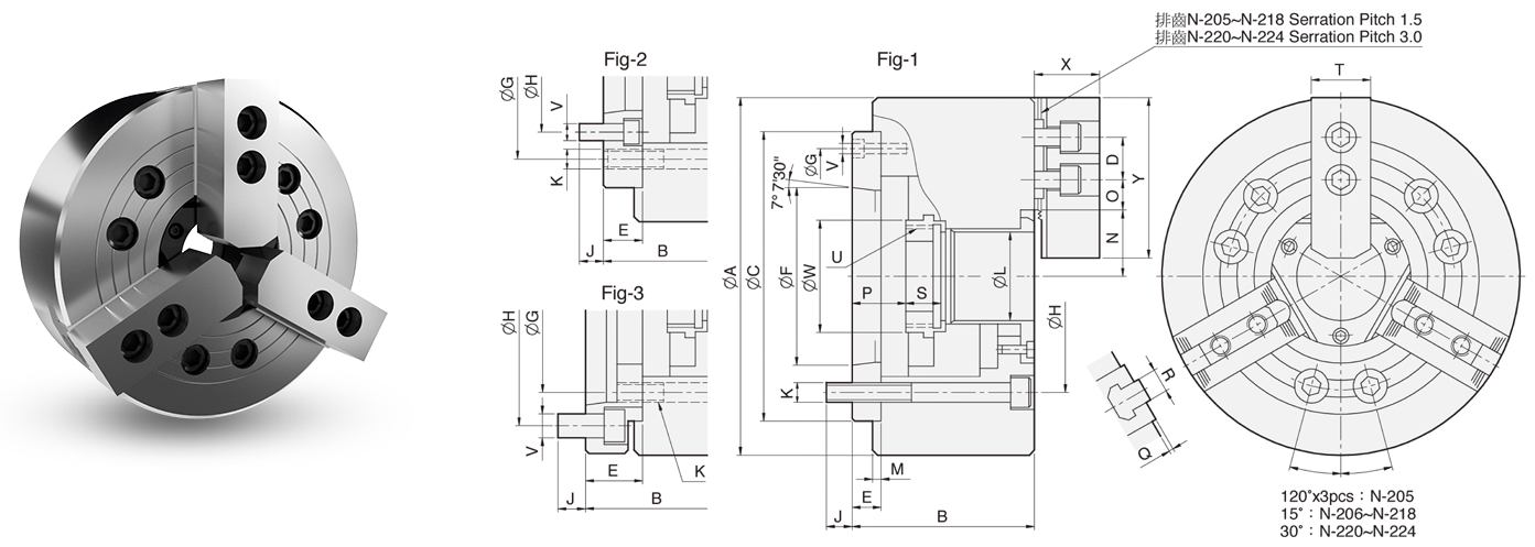 - Model N-200A chucks are assembled with adaptor for ASA B5.9 type A spindles.