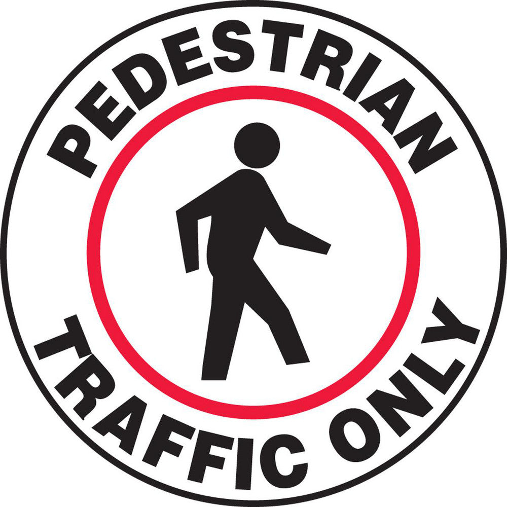 Adhesive Backed Floor Signs; Message Type: Traffic Control; Message/Graphic: Message & Graphic; Message or Graphic: Message & Graphic; Legend: PEDESTRIAN TRAFFIC ONLY; Material: Vinyl; Legend Color: Black; Color: Red, White, Black; Shape: Circle