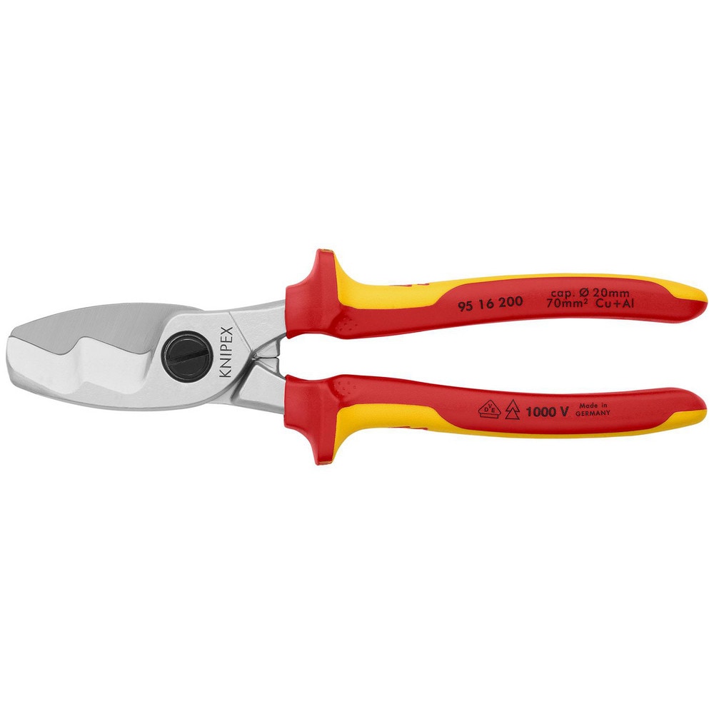 Features | For cutting copper and aluminum cables. Not suitable for steel wire and hard drawn copper conductors. Precision ground, hardened blades. Clean and smooth cut without crushing and deformation. By dividing the cutting actions into initial cut (insulating sheath in the front cutting area) and final cut (conductor in the back cutting area), cables up to 25/32" dia. can be cut in one-hand operation. Less effort required due to favorable lever ratio and optimized cutting edge geometry. Pinch guard prevents operators' fingers being pinched. Adjustable bolted joint, self-locking. 1000V multi-component grips, VDE-tested. High-grade special tool steel; forged, oil-hardened. |