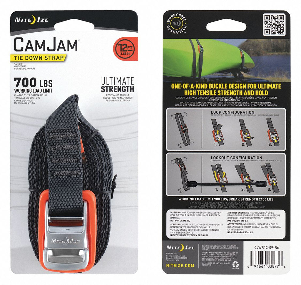 Tie Down Strap, 12 ft.L x 1"W, 700 lb. Load Limit, Adjustment: Cam Buckle