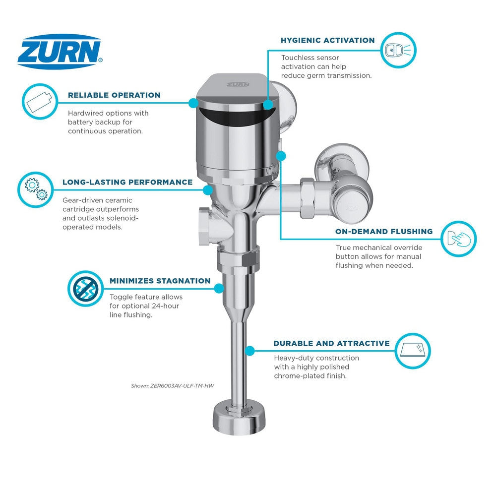 Automatic Flush Valves; Valve Type: Urinal; Flush Style: Single Flush; Gallons Per Flush: 0.125; Flush Valve Location: Exposed; Pipe Size: 0.75 in; Spud Coupling Size: 1.5 in; Cover Material: Chrome; Power Source: Hard Wire, 4AA Battery Backup