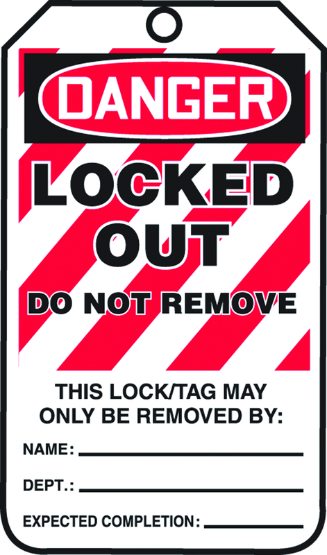 •Brand Name: Accuform •Color: Red/Black On White •Header: Danger •Height: 5-3/4 •Material: Plastic •Message - Back: This Energy Source Has Been Locked Out! Unauthorized Removal Of This Lock/Tag May Result In Immediate Discharge •Message - Front: Locked Out •Shape: Rectangle •Width: 3-1/4