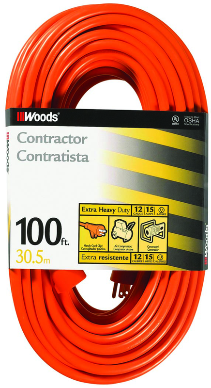 •Brand Name: Woods •Color: Orange •Duty: Extra Heavy •Length: 100' •Outlet: 1 •Plug: Single •Style: Outdoor •UL Rating / Volt: 300 •Wire Gauge: 12/3 •125V Rating: 15A