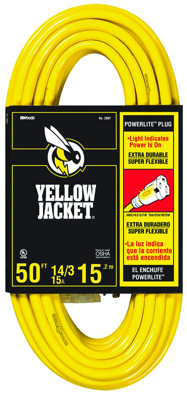 •PowerliteExtension Cords Contractor Grade •Yellow Jacket® cords are 3 times as abrasion resistant as a standard vinyl cord SJTW. •Powerliteindicator plug glows when the cord has power. •Single molded plugs are clear, rugged, durable and oversized. •Power block stands up to heat, cold and rough use on jobsites. •Yellow Jacket® cord features exclusive high-gloss, extra durable super flexible wire SJTW.