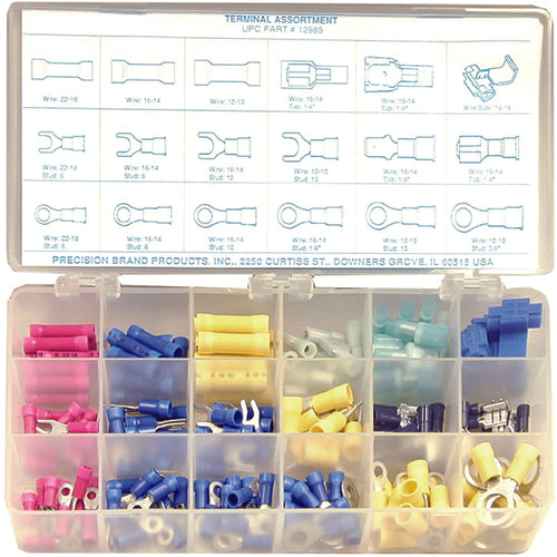 Set Includes | (10) each of 22-18 Butt Splice; 16-14 Butt Splice; 12-10 Butt Splice; 16-14 Insulated Female Terminal; 16-14 Insulated Male Terminal; 22-18 Stud 6 Spade Terminal; 16-14 Stud 6 Spade Terminal; 16-14 Stud 10 Spade Terminal; 12-10 Stud 10 Spade Terminal; 16-14 Non-Insulated Male Terminal; 16-14 Non-Insulated Female Terminal; 22-18 Stud 6 Ring Terminal; 16-14 Stud 6 Ring Terminal; 16-14 Stud 10 Ring Terminal; 16-14 Stud 1/4″ Ring Terminal; 12-10 Stud 10 Ring Terminal; and 12-10 Stud 3/8″ Ring Terminal; and 5 Self-Splicing Connectors. |
