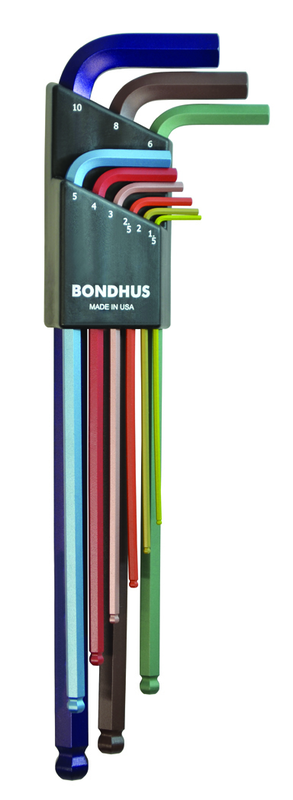 •Arm Length: 2.8 - 6.8" •Arm Style: Color Code Long •Brand Name: Bondhus •Driver Style: Ball End •Made In: USA •Number of Pieces: 9 •Overall Length: 11 •Set Includes: 1.5, 2, 2.5, 3, 4, 5, 6, 8, 10mm •Size: 1.5 - 10mm