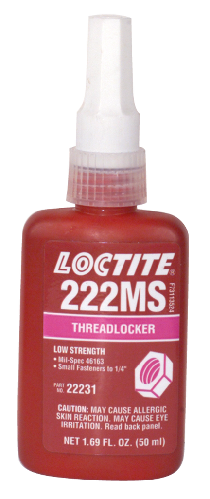 •Brand Name: Loctite •Color: Purple •Container: Bottle •Description: Low strength threadlocker for small fasteners up to 1/4" •Hazard Code: HAZ57 •Model No.: 222 •Size: 50ml •Strength: Low •Style: Threadlocker