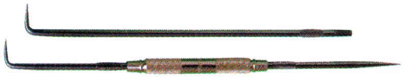•Handle and points have knurled grip •Length of scriber with short bent point is 9 inches and with long bent point, 12 inches •Points screw into handle and will fit either end •Knurled handle is nickel plated.