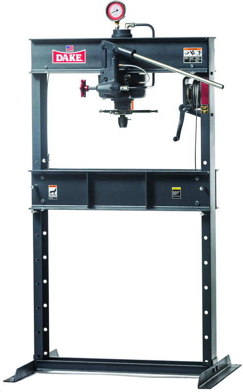 •Hand operation for economical performance. •By-pass hole prevents excessive ram extension. •Rapid screw traverse of ram permits quick, easy movement of the ram by means of a convenient handwheel. Rapid ram return starts as soon as release valve is opened and may be stopped at any point by closing the valve. •Adjustable table with self-locking hoist •Proudly Made in the USA •1 Year Warranty on all Dake Presses •F.O.B. GRAND HAVEN, MI