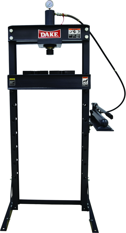 •Base: 24 x 28 •Brand Name: Dake •Capacity (tons): 10 •Height: 60 •Maximum Ram To Table: 38 •Minimum Ram To Table: 0-4 •Model Number: F-10 •Ram Travel (in): 6 •Type: Hand Operated Hydraulic Press •Weight: 225 lbs •Width Between Uprights: 16-3/4